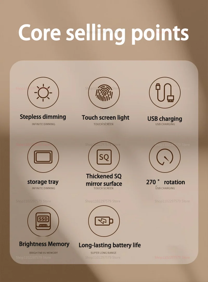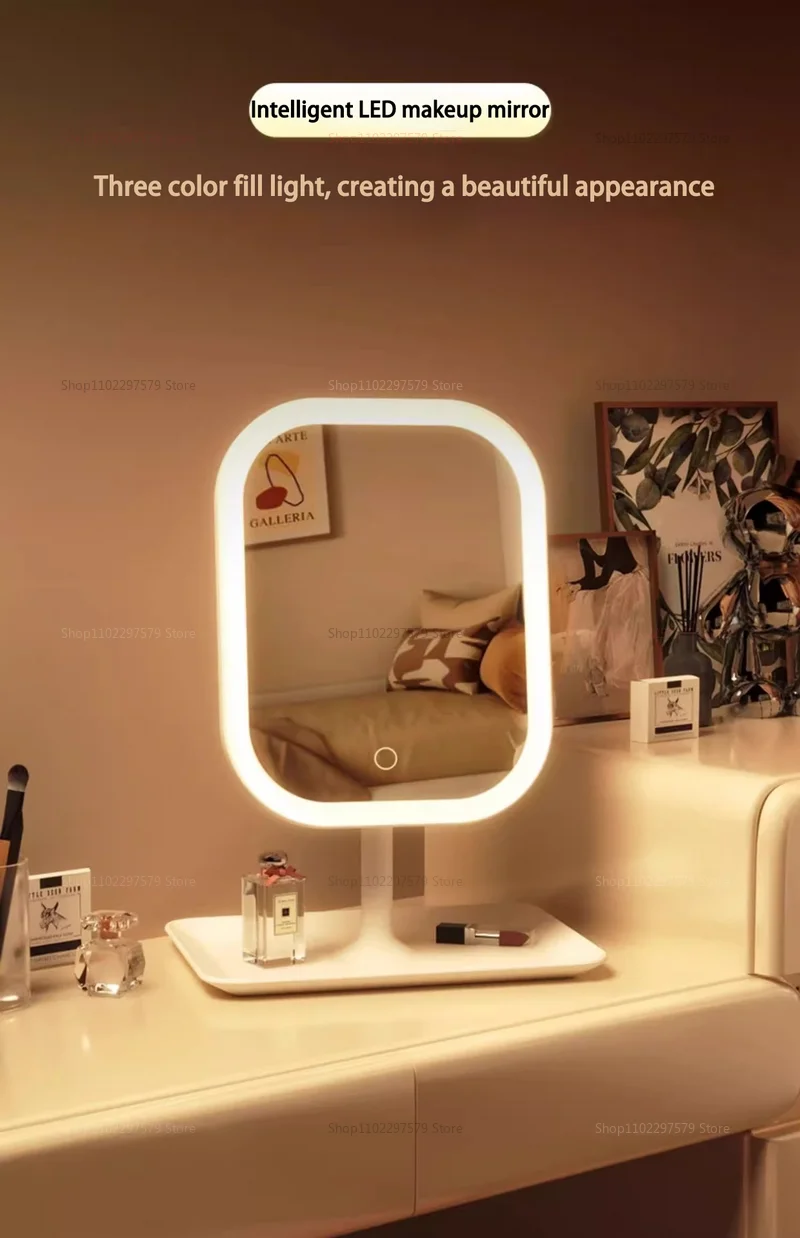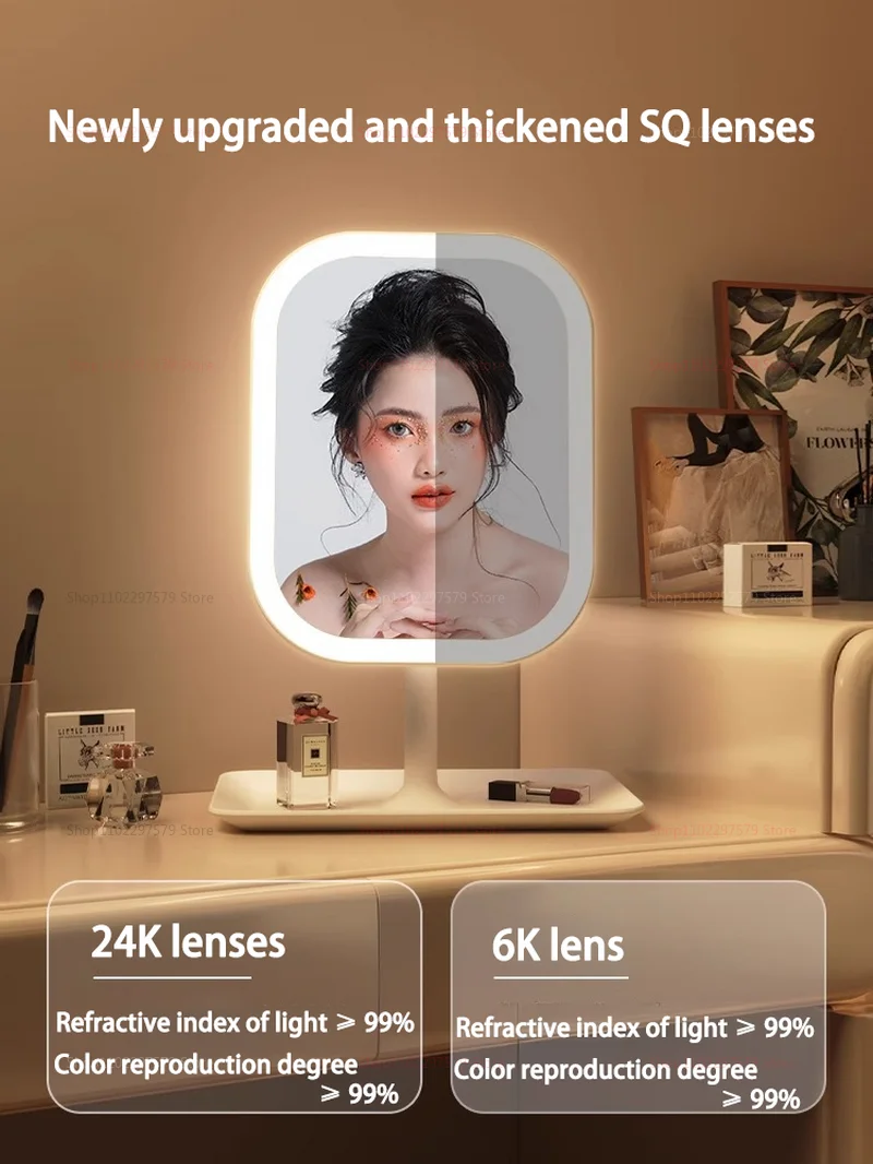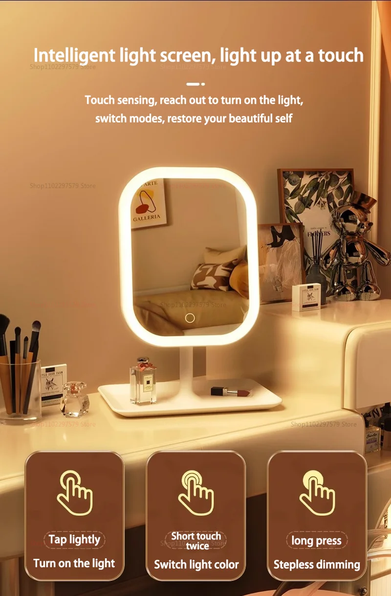 O espelho é muito resistente e possui uma textura de qualidade. Ele também possui três luzes coloridas que podem ser ajustadas, tornando-o muito conveniente de usar. O espelho oferece uma reflexão muito nítida e vem com iluminação embutida, tornando a aplicação de maquiagem mais prática. A iluminação também possui três cores que podem ser ajustadas pelo usuário, e o brilho da luz não é ofuscante, mas ilumina a maquiagem de forma excelente! Há uma bandeja de armazenamento embaixo do espelho 💕 , É conveniente colocar um batom ou blush em pó 🌸 , 🌟 E o espelho é removível. ✨ ✨ , É fácil de transportar em viagens 👍 👍